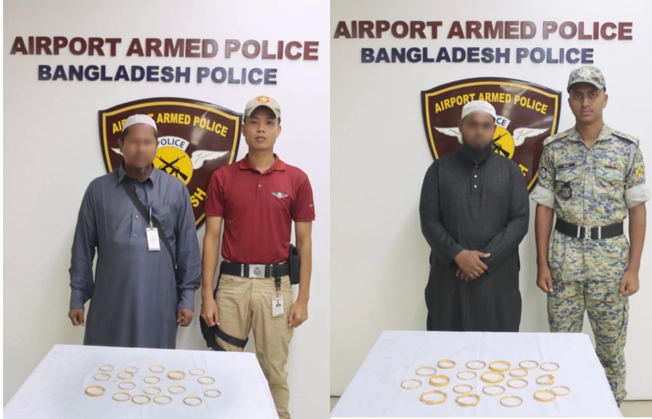 ঢাকা:- হযরত শাহজালাল আন্তর্জাতিক বিমানবন্দরে ৮৯৬ গ্রাম স্বর্ণালঙ্কারসহ দুইজন ব্যক্তিকে আটক করেছে এয়ারপোর্ট আর্মড পুলিশ ব্যাটালিয়ন (এপিবিএন)।আটককৃতরা হলেন মোঃ হাছান (৩৯) এবং মোঃ শাহাজান (৪৯)।মঙ্গলবার (৮ জুলাই) দুপুর ২টার দিকে বিমানবন্দরের আগমনী ০১ নং ক্যানোপি এলাকা থেকে তাদের আটক করা হয়।পুলিশ জানায়, সন্দেহজনক আচরণ লক্ষ্য করে এপিবিএন সদস্যরা তাদের থামানোর চেষ্টা করলে তারা পালানোর চেষ্টা করে।পরে ধাওয়া করে দুজনকেই আটক করা হয়।তল্লাশির সময় মোঃ হাছানের পাঞ্জাবীর পকেট থেকে ৫০২ গ্রাম এবং মোঃ শাহাজানের পকেট থেকে ৩৯৪ গ্রাম স্বর্ণালঙ্কার উদ্ধার করা হয়, যার বাজারমূল্য প্রায় ১ কোটি ৭ লাখ ৪ হাজার ৩০০ টাকা।স্বর্ণালঙ্কার গুলো ২১ ও ২২ ক্যারেট মানের বলে নিশ্চিত করেছে কর্তৃপক্ষ।