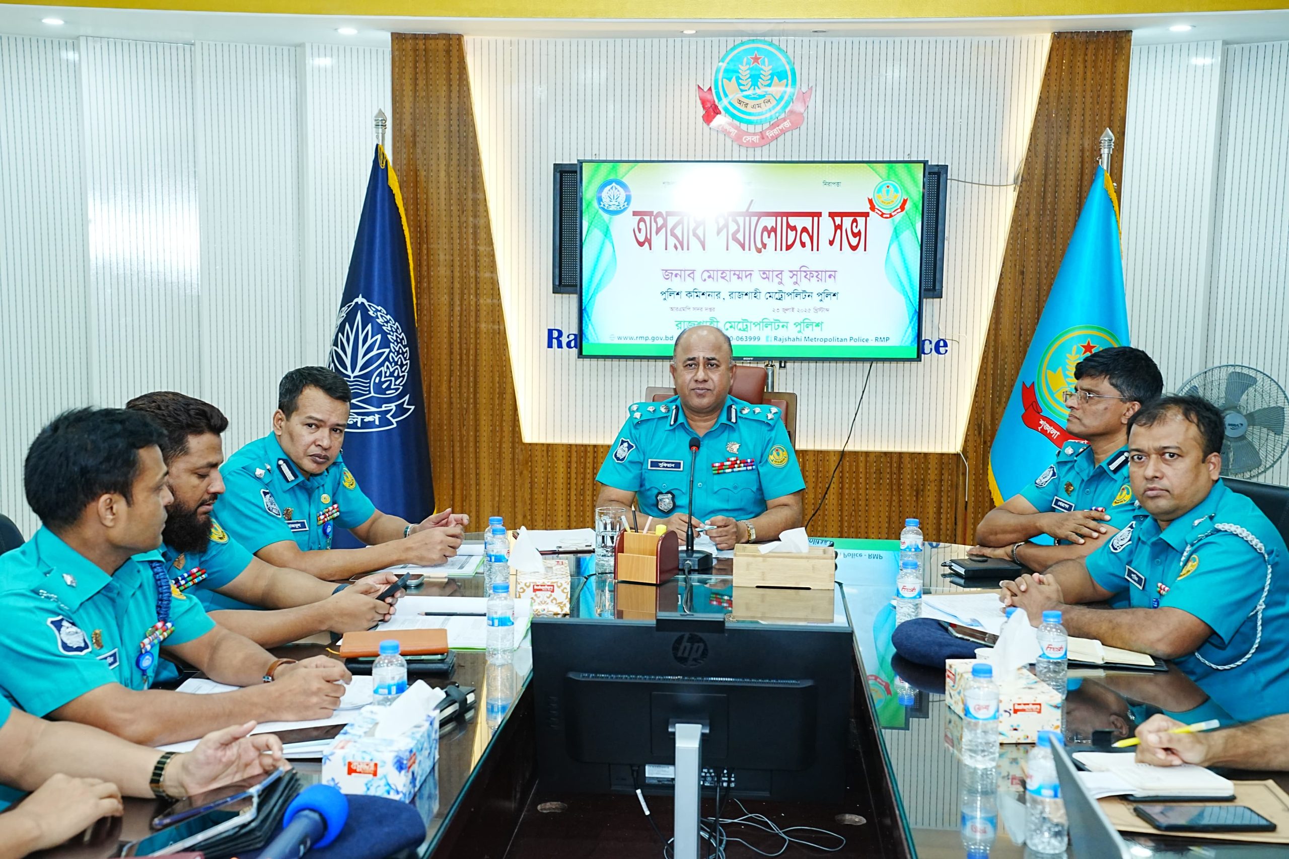 আরএমপি নিউজ:- ২৩ জুলাই ২০২৫ খ্রিস্টাব্দ সকাল ১০.৩০ টায় রাজশাহী মেট্রোপলিটন পুলিশ সদর দপ্তরের কনফারেন্স রুমে অনুষ্ঠিত হলো জুন' ২৫ মাসের মাসিক অপরাধ পর্যালোচনা সভা।সভায় সভাপতিত্ব করেন রাজশাহী মেট্রোপলিটন পুলিশের পুলিশ কমিশনার মোহাম্মদ আবু সুফিয়ান।তিনি মহানগরীর সার্বিক আইনশৃঙ্খলা পরিস্থিতি গভীরভাবে পর্যালোচনা করেন।সভায় কিশোর অপরাধের বর্তমান প্রবণতা, মাদক ও অবৈধ অস্ত্র উদ্ধার অভিযানের অগ্রগতি, গ্রেফতারি পরোয়ানা তামিল, চাঁদাবাজ, অবৈধ দখলকারীদের বিরুদ্ধে আইনি পদক্ষেপ গ্রহণ এবং মহানগরীর সামগ্রিক আইনশৃঙ্খলা পরিস্থিতি নিয়ে আলোচনা করেন।