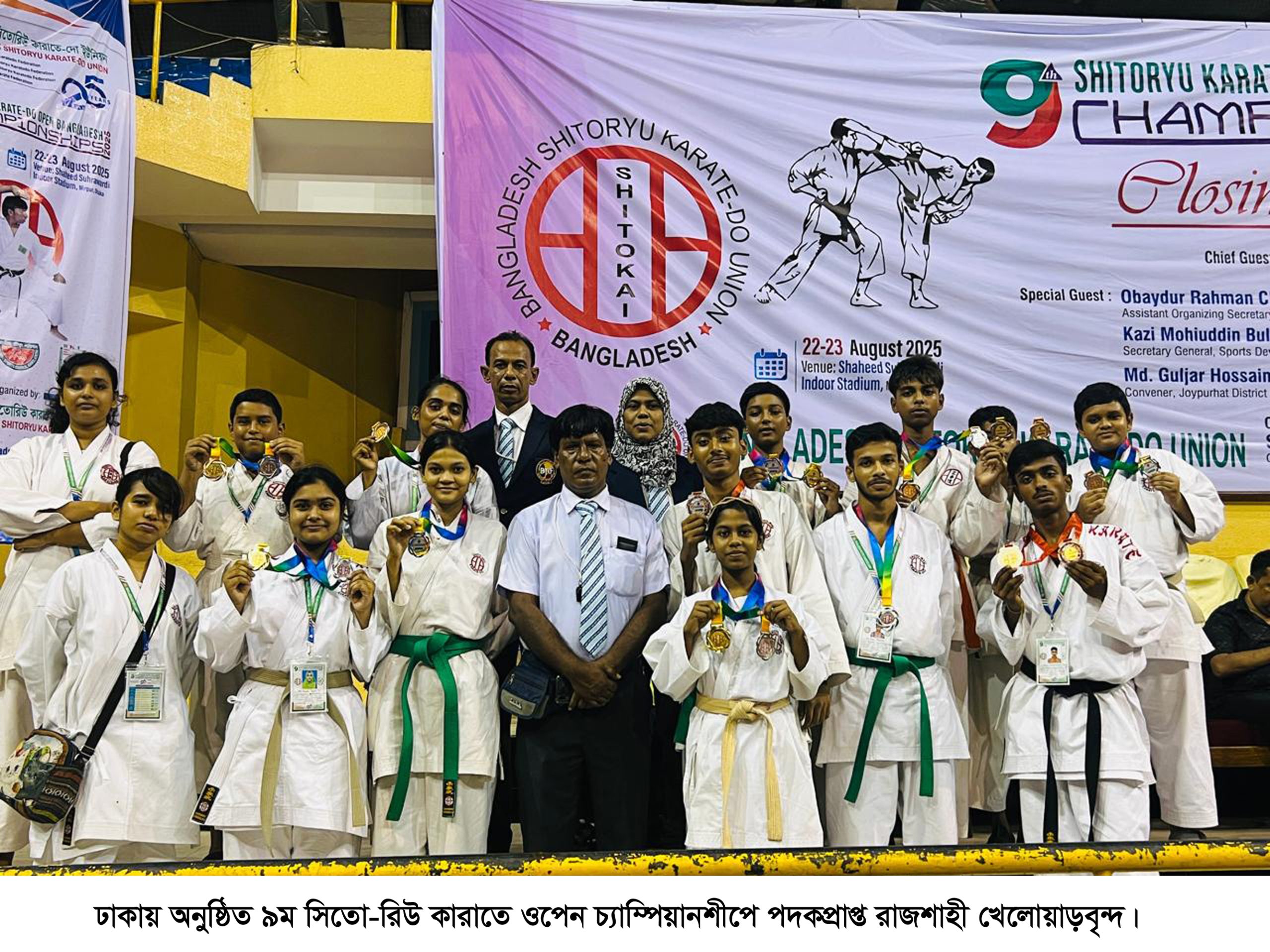 রাজশাহী:- ঢাকায় অনুষ্ঠিত ৯ম সিতো-রিউ কারাতে ওপেন চ্যাম্পিয়ানশীপ মিরপুর ইনডোর স্টেয়ামে অনুষ্ঠিত হয়।উক্ত চ্যাম্পিয়ানশীপে সারা দেশ থেকে প্রায় ১ হাজারেরও বেশী ছেলে-মেয়ে অংশ গ্রহন করে।বাংলাদেশ সিতো-রিউ কারাতে-দো এসোসিয়েশন রাজশাহী প্রধান কার্যালয় থেকে ১৫জন খেলোয়াড়, একজন কোচ ও আটজন রেফারি অংশগ্রহন করে।চ্যাম্পিয়নশিপে মোট ৫টি স্বর্ণ, ৯টি রৌপ্য, ১১টি ব্রােঞ্জ পদক অর্জন করে।পদকপ্রাপ্তরা হলো, মোসাঃ মাদিহা চৌধুরী- ৩টি স্বর্ণ পদক পেয়ে সেরা পুরস্কারে ভূসিত হয়।ইয়াসিন আলী-১টি রৌপ্য ও ১ টি ব্রােঞ্জ।মোঃ অর্ণব হোসেন-১টি রৌপ্য ও ১ টি ব্রােঞ্জ।মোঃ অরণ্য-১টি স্বর্ণ ও ১টি রৌপ্য।মোঃ হাসান আজমাইন-২টি ব্রােঞ্জ।