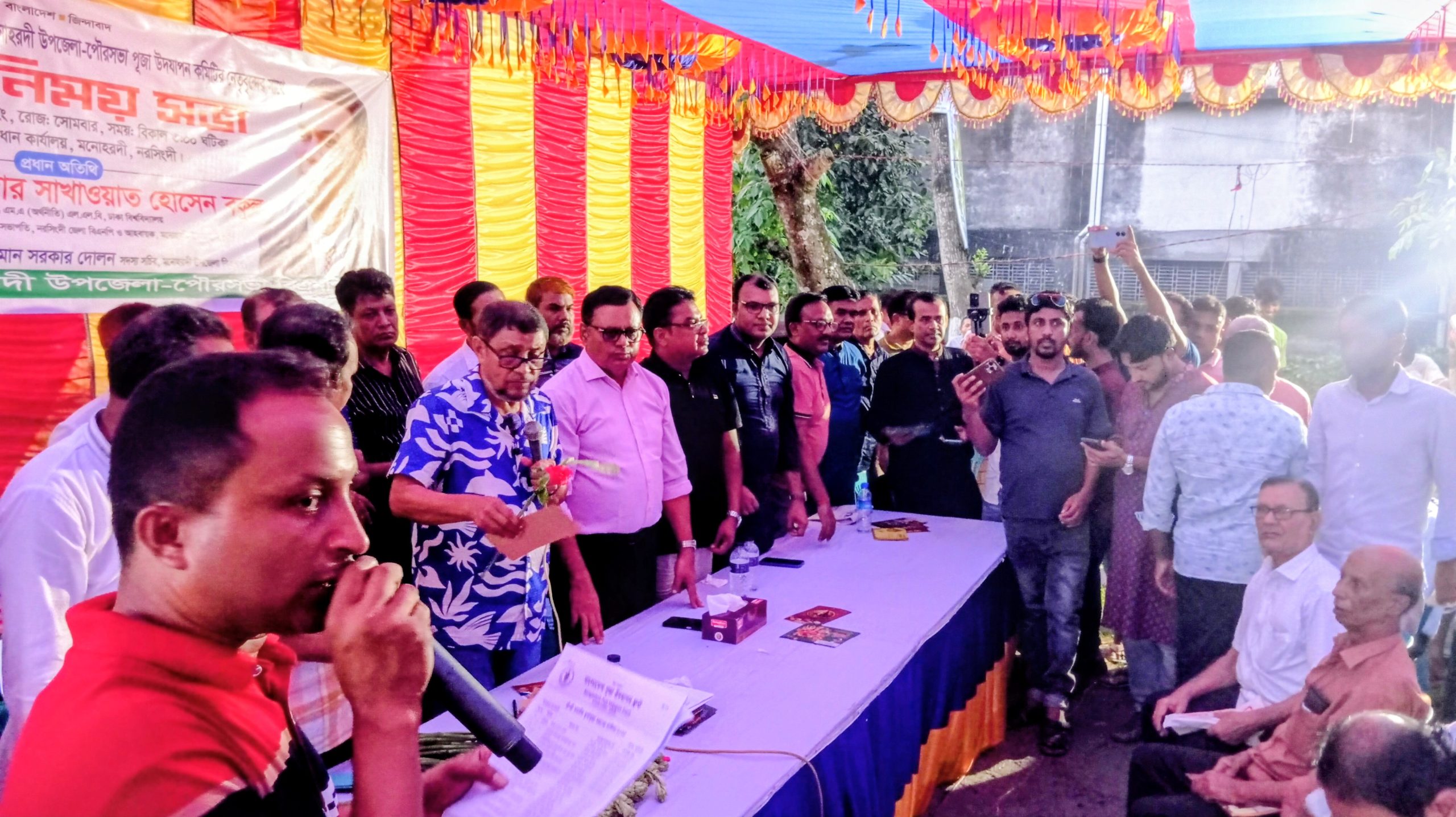নরসিংদী:-নরসিংদীর মনোহরদীতে শারদীয় দুর্গাপূজা উপলক্ষ্যে সনাতন ধর্মাবলম্বীদের সঙ্গে এক মতবিনিময় সভা ও পূজা মণ্ডপে আর্থিক অনুদান বিতরণ করা হয়েছে।সোমবার বিকেলে উপজেলা বিএনপির কার্যালয় প্রাঙ্গণে আয়োজিত সভায় প্রধান অতিথি হিসেবে উপস্থিত ছিলেন সাবেক সংসদ সদস্য ও নরসিংদী জেলা বিএনপির জ্যেষ্ঠ সহ-সভাপতি সরদার সাখাওয়াত হোসেন বকুল।সভায় তিনি বলেন, সম্প্রীতির বার্তা নিয়েই আমরা এগিয়ে যেতে চাই।দুর্গাপূজা শুধু একটি ধর্মীয় উৎসব নয়, এটি আমাদের ঐতিহ্য ও সংস্কৃতির অংশ।এই সৌহার্দ্য ও সহাবস্থানের পরিবেশ আমাদের অক্ষুণ্ন রাখতে হবে।অনুষ্ঠানে উপজেলার ৫৩টি দুর্গাপূজা মণ্ডপের প্রতিটির সভাপতি ও সাধারণ সম্পাদকের হাতে ৫ হাজার টাকা করে মোট ২ লাখ ৬৫ হাজার টাকা আর্থিক অনুদান তুলে দেওয়া হয়।