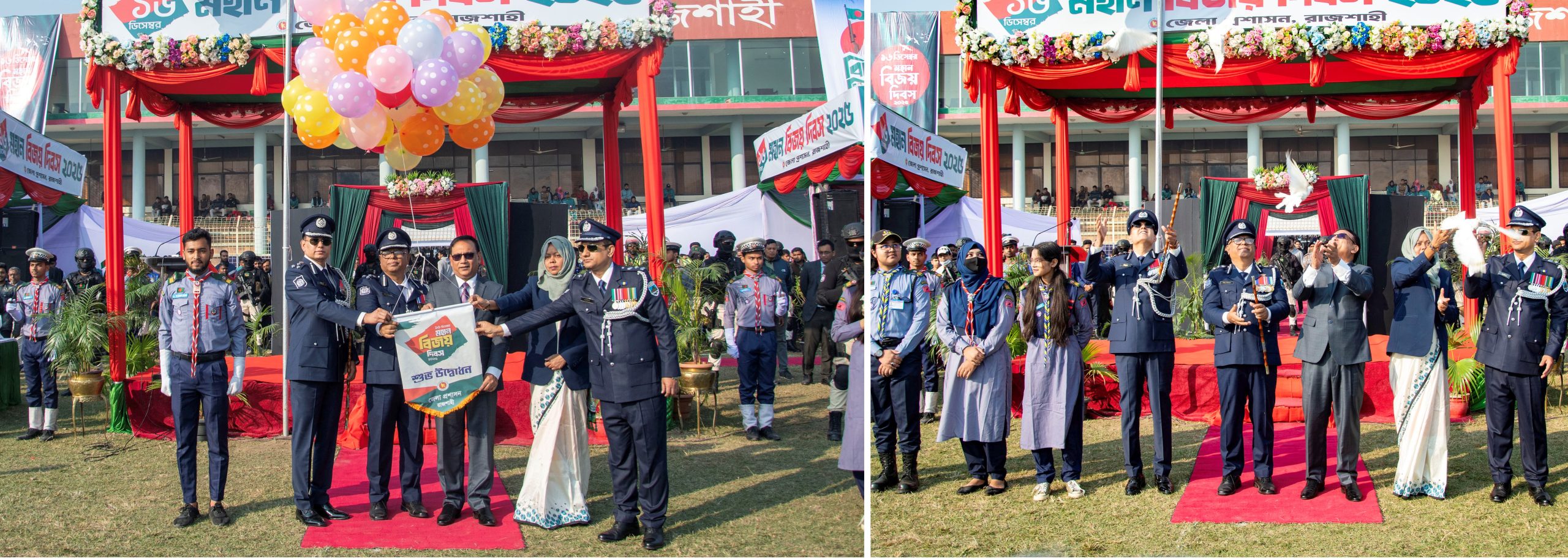 রাজশাহী:- ১৬ ডিসেম্বর, মহান বিজয় দিবস।বাঙালি জাতির ইতিহাসে এক ঐতিহাসিক দিন।রাজশাহীতে দিবসটি যথাযোগ্য মর্যাদা ও উৎসাহের সাথে উদযাপিত হয়।গত মঙ্গলবার সূর্যোদয়ের সাথে সাথে সকলসরকারি, আধা-সরকারি, স্বায়ত্তশাসিত প্রতিষ্ঠান ও বেসরকারি ভবন সমূহে জাতীয় পতাকা উত্তোলন এবং জেলা পুলিশ লাইন্সে ৩১ বার তোপধ্বনিরমা ধ্যমে দিবসটির কার্যক্রম শুরু হয়।সকাল ৬টা ৪২ মিনিটে কালেক্টরেট চত্বও শহিদ স্মৃতিস্তম্ভে বিভাগীয় কমিশনার (অতিরিক্ত সচিব) ড. আ.ন.ম. বজলুররশীদ, রাজশাহী রেঞ্জের ডিআইজি মোহাম্মদ শাহজাহান, রাজশাহী মেট্রোপলিটন পুলিশ কমিশনার ড. মো. জিল্লুর রহমান, জেলা প্রশাসক আফিয়া আখতার, পুলিশ সুপার মোহাম্মদ নাঈমুল হাছান, বিভাগীয় ও জেলা পর্যায়ের বিভিন্ন সরকারি, বেসরকারি ও স্বায়ত্তশাসিত দপ্তর ও সংস্থা প্রধান, রাজনীতিবিদ, ব্যবসায়ী, সাংবাদিক, বিভিন্ন সামাজিক, সাংস্কৃতিক...