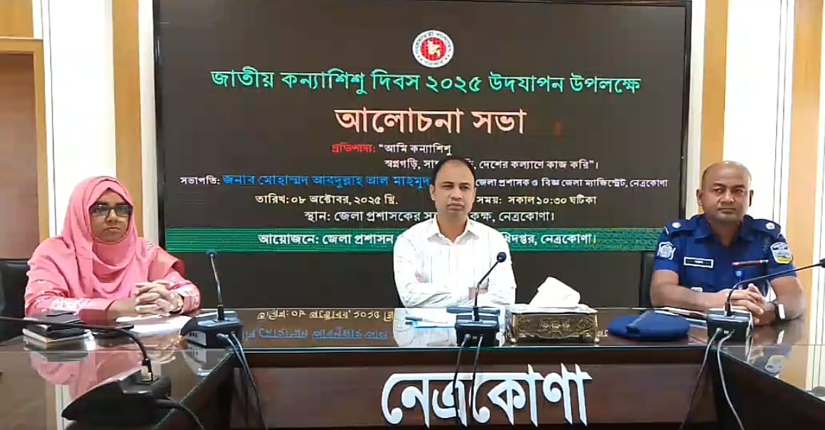 নেত্রকোনা:- আমি কন্যাশিশু স্বপ্ন গড়ি,সাহসে লড়ি, দেশের কল্যাণে কাজ করি—এই প্রতিপাদ্যকে সামনে রেখে নেত্রকোনায় জাতীয় কন্যাশিশু দিবস-২০২৫ উদযাপন উপলক্ষে আলোচনা সভা অনুষ্ঠিত হয়েছে।বুধবার (৮ অক্টোবর) সকালে জেলা প্রশাসন ও মহিলা বিষয়ক অধিদপ্তরের আয়োজনে জেলা প্রশাসক কার্যালয়ের সম্মেলন কক্ষে এ আলোচনা সভা অনুষ্ঠিত হয়।