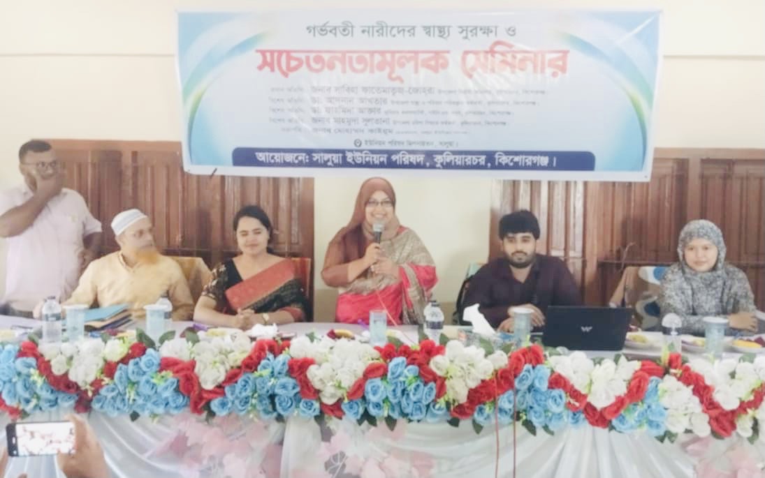 কিশোরগঞ্জ:- কিশোরগঞ্জের কুলিয়ারচরে গর্ভবতী নারীদের স্বাস্থ্য সুরক্ষা ও সচেতনতামূলক সেমিনার অনুষ্ঠিত হয়েছে।বুধবার (২০আগস্ট) দুপুরে সালুয়া ইউনিয়ন পরিষদ হলরুমে ইউনিয়ন পরিষদ কর্তৃক আয়োজিত সেমিনারে প্রধান অতিথি হিসেবে উপস্থিত ছিলেন, উপজেলা নির্বাহী অফিসার (ইউএনও) সাবিহা ফাতেমাতুজ্-জোহরা।এসময় সালুয়া ইউনিয়ন পরিষদের চেয়ারম্যান মোহাম্মদ কাইয়ুম এর সভাপতিত্বে বিশেষ অতিথি হিসেবে উপস্থিত ছিলেন, উপজেলা স্বাস্থ্য ও পরিবার পরিকল্পনা কর্মকর্তা ডা. আদনান আখতার, জুনিয়ার কনসালটেন্ট, গাইনি এন্ড অবস্ ডা. ফাহমিদা আক্তার ও উপজেলা মহিলা বিষয়ক কর্মকর্তা মাহমুদা সুলতানা।