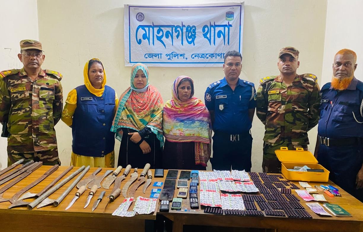 নেত্রকোনা:- নেত্রকোনার মোহনগঞ্জে জাল টাকা ও দেশীয় অস্ত্রসহ শিউলী (৪০) ও মদিনা আকন্দ (১৮) কে আটক করেছে যৌথবাহিনী। শনিবার রাত সাড়ে ১২টা থেকে আড়াইটা পর্যন্ত ২ ঘন্টা ব্যাপী অভিযান পরিচালনা করে পৌর শহরের কাজিয়াটি এলাকা থেকে তাদেরকে আটক করা হয়। মোহনগঞ্জ অস্থায়ী সেনা ক্যাম্পের লে. মোঃ মাহমুদুল হাসান মেহেদী এক সংবাদ বিজ্ঞপ্তিতে জানান, কাজিয়াটি গ্রামের ফয়সাল মাদক ব্যবসায়ী আটক করার জন্য অভিযান পরিচালনা করলে উপস্থিতি টের পেয়ে ফয়সাল পালিয়ে যায়।